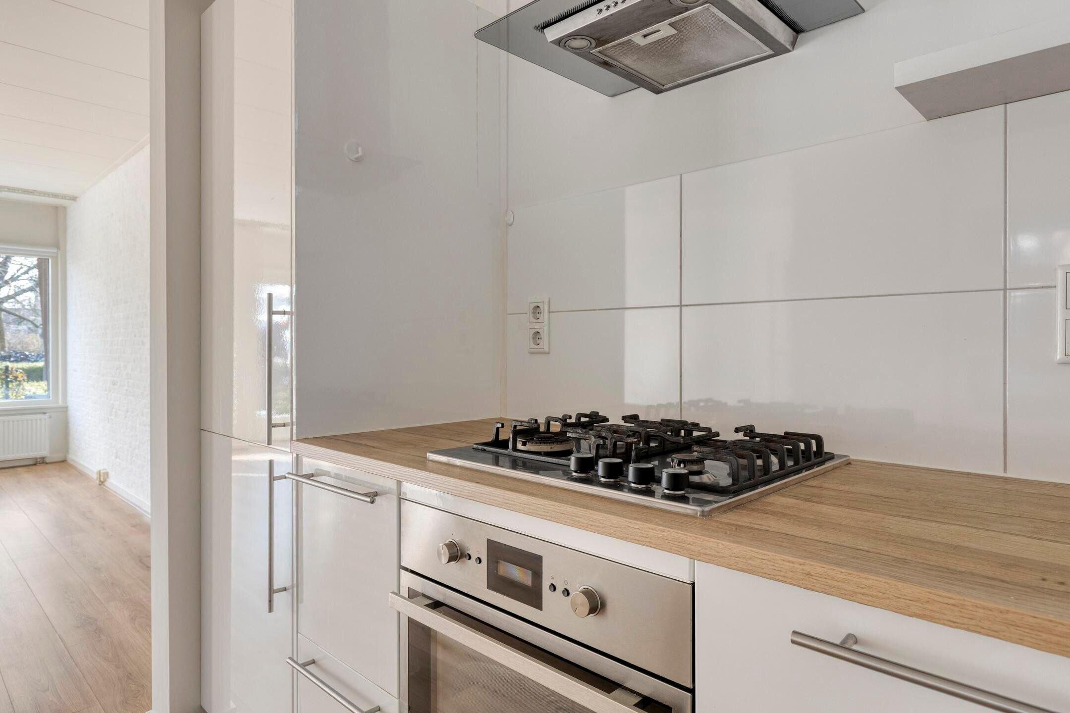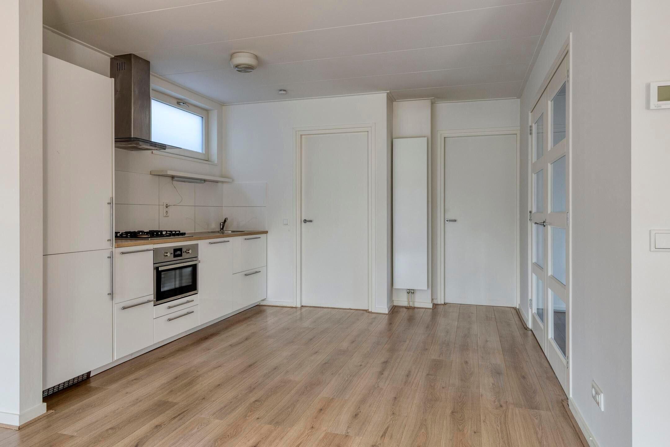 Indeling: zij-entree, hal, toilet met fonteintje, grote living met deur naar het ruim bemeten, zonnig terras, open keuken met wit keukenblok vzv koel-/vriescombinatie, vaatwasser, kookplaat, afzuigkap, combi-magnetron/oven, direct aansluitend een bijkeuken met cv-ketel en wasmachine aansluiting,