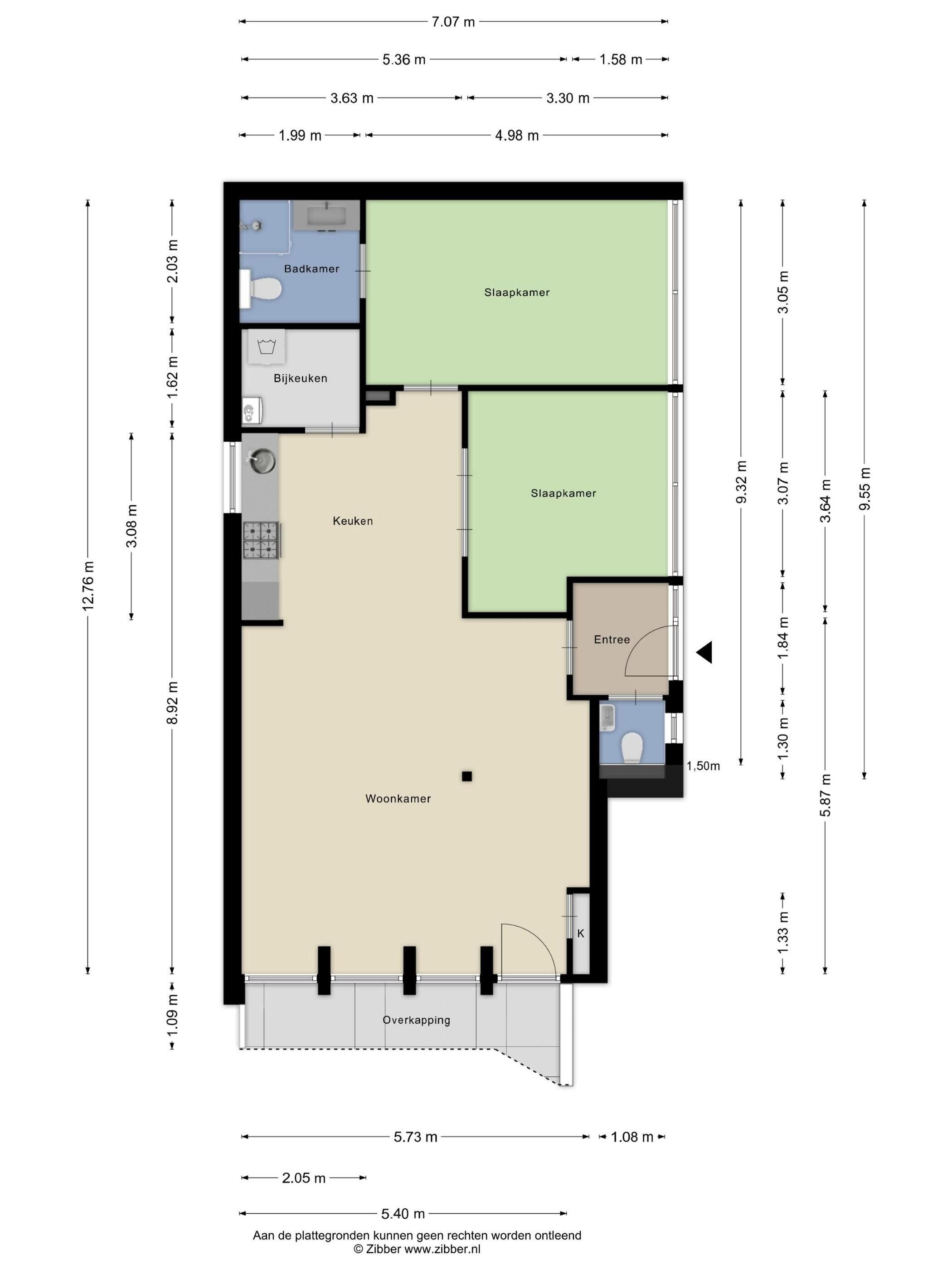 - 10 m² (5,14 meter diep en 2,07 meter breed)